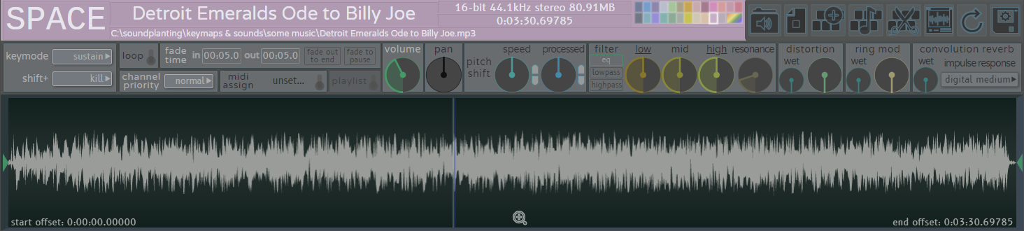 The waveform display at bottom shows an overview of the sound's waveform. While the sound is playing, a moving playhead indicates the playback position of the most recent trigger instance of the key, and you can click anywhere along the highlighted part of the waveform to seek the playhead to that point in the sound. The waveform display includes controls for setting the sound's start offset and end offset. This allows limiting the portion of the sound that is played when the key is pressed; use offsets to, for example, trim silence, remove an unwanted song introduction, refine a loop, or extract individual sounds out of a larger track (see the slice multi-key function for a quick automated way to splice portions of a sound across multiple keys). Define start and end points using the left and right sliders, or more precisely by entering zoom view to edit offset points in a full screen zoomable version of the waveform. Offset changes are applied in realtime allowing start and end points to be adjusted while playing the sound, especially handy when adjusting loop points. Along the bottom of the waveform, the start offset and end offset positions are shown; note that these value are relative to the duration of the sound at its default normal speed and won't reflect any speed changes made with pitch shift. ▰ Double click the waveform to reset the offset selection back to the entire length of the sound.