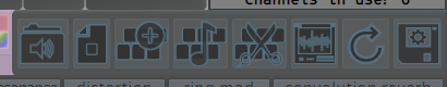 There are 7 realtime effects units which can be used in combination to tweak the sound or alter it beyond recognition, all non-destructively (not permanently saved in the source sound file). Soundplant is more intended for low latency sound triggering than serious DSP use, but offers these lightweight filters to modify and tune sound. Effect labels are highlighted to indicate whether they are active or not. When active, each effect is a part of the sound's realtime processing graph and uses computer resources, which can effect latency and sound quality. Most effects are computed uniquely per-key, which allows infinite possibilities for sound design but also means that turning on a lot of different effects on a lot of different keys can quickly multiply the CPU resources required and potentially lead to latency or audio glitches especially on slower computers. Volume, pan, and pitch speed are computationally inexpensive but others can require more complex processing. The processing graph essentially flows from left to right in the order that the effects controls are laid out in the Soundplant interface: the volume unit is the base sound emitter, which is connected to all other units in a chain ending at reverb.