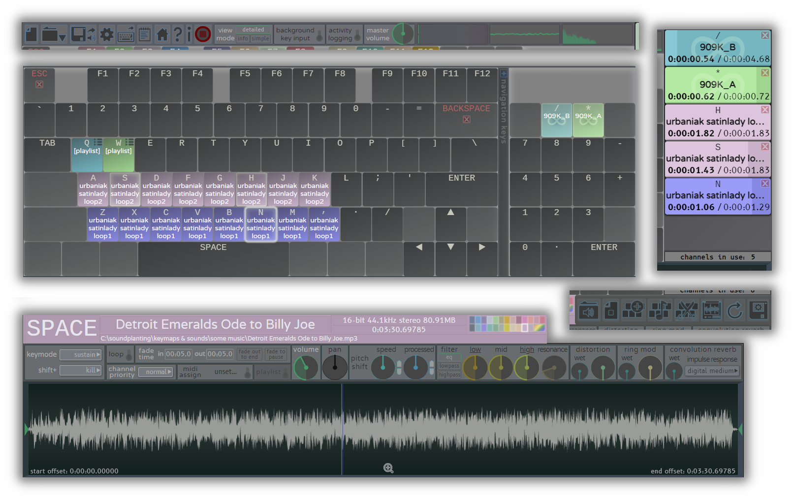 Soundplant is live performance audio software that turns your computer keyboard (yes, your QWERTY keyboard) into a versatile, low latency, multitrack sample trigger and playable musical instrument. It allows the assignment of sound files of any format and length onto virtually all keyboard keys, giving you hours of instantly-playing random access audio at your fingertips with no extra hardware needed. Use Soundplant as a performance, presentation, or installation tool, as a drum pad, as an educational aid, to mix together tracks in realtime, trigger sound effects or background tracks during a show, create music or loops, sketch sound designs, make beats, and give new life to old sounds - all via an input device you've been practicing on for as long as you've been typing. Because it's a standalone software sampler that uses your own samples to create custom soundboards, Soundplant is an infinitely flexible electronic instrument limited only by the variety of sounds that you feed it. An easy to use interface provides drag & drop configuration of each key, including options which control the way each sound is triggered along with several lightweight non-destructive realtime effects. Playing sounds are displayed with a progress bar and track time, and you can even trigger sounds with Soundplant hidden while using any other program.