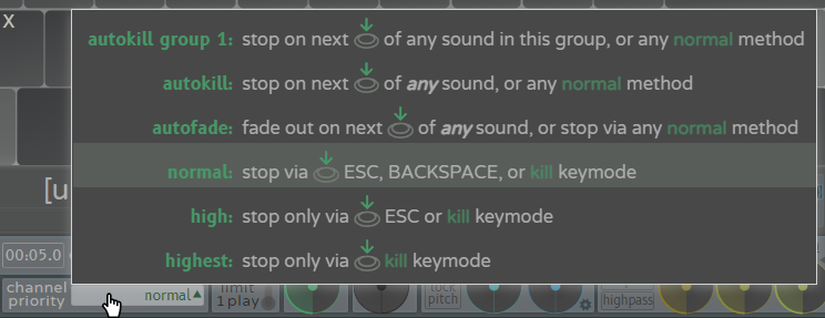 - highest priority sounds can only be killed by pressing the key itself in 'kill' keymode; neither Escape nor Backspace/Delete will stop it.