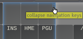 There are 3 collapsible-expandable keyboard sections, divided into main keys (all main numbers & letters), navigation keys (Home/End/arrows/etc.), and numpad (the numeric keypad). Sections can be collapsed by clicking on the blue minimize button that appears in the upper right corner of each section when hovered over (see pic). At least one section must remain expanded at any time. If the navigation keys are collapsed but the main keys remain open, the arrow keys slide over to the main keyboard area, as on most laptops layouts.