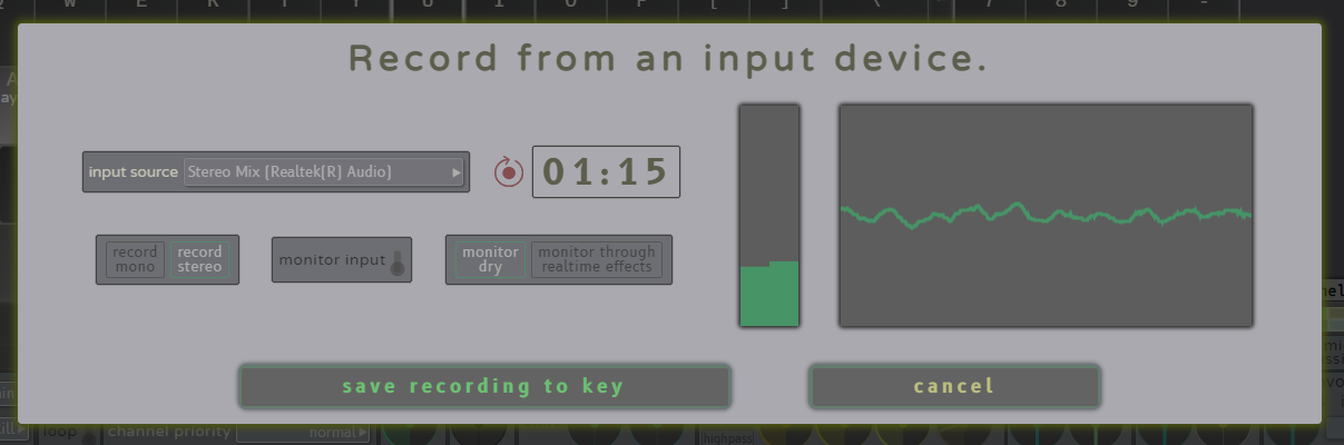 Multiple keys can be selected by holding down Ctrl (Windows) or Command ⌘ (Mac) and single-clicking the desired keys, or Ctrl/⌘+clicking and dragging to select a range of keys, or Shift+clicking to select all keys between the clicked key and the last selected key. This allows for settings to be adjusted in bulk for many keys simultaneously in realtime. Multi-key selection mode can be exited by single clicking any key, or by pressing the Escape key (note: hitting Escape while in multi-key selection mode will not stop any sounds). When in multi-key selection mode, settings that differ between keys will appear blurred out or invisible until they are adjusted to make the settings identical. If the keys selected all have the same sound file assigned then the waveform will display and start and end offsets are bulk-settable; if offset settings differ between keys with the same sound then the differing offset slider will have a contrasting color until clicked to make the settings identical.