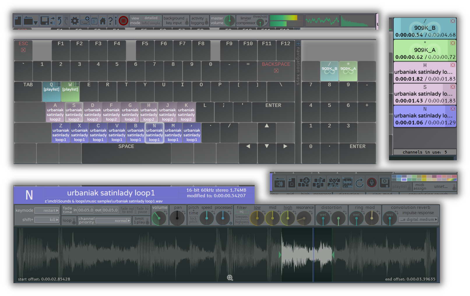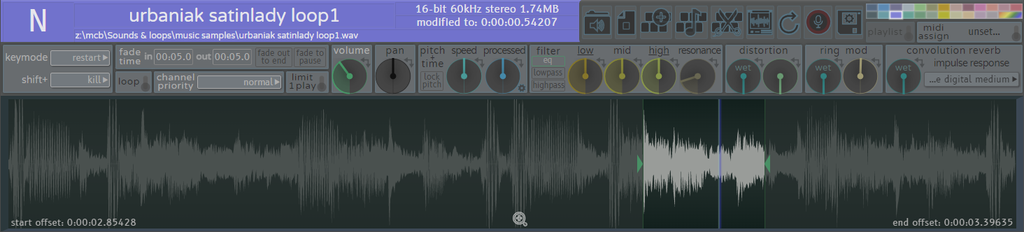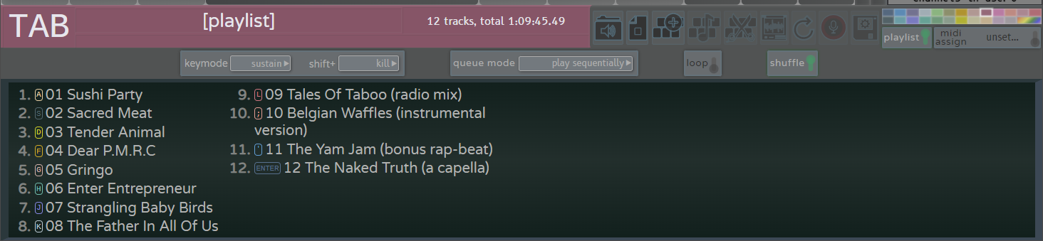 - experiment with playlists: use them as a poor man's sequencer to compose drum patterns or melodies; use 'shuffle' in combination with 'loop' to create interesting randomized sequences; use 'start all simultaneously' to make interesting combinations of sound effects; use 'single key step through' in combination with 'shuffle' to trigger randomly chosen sounds